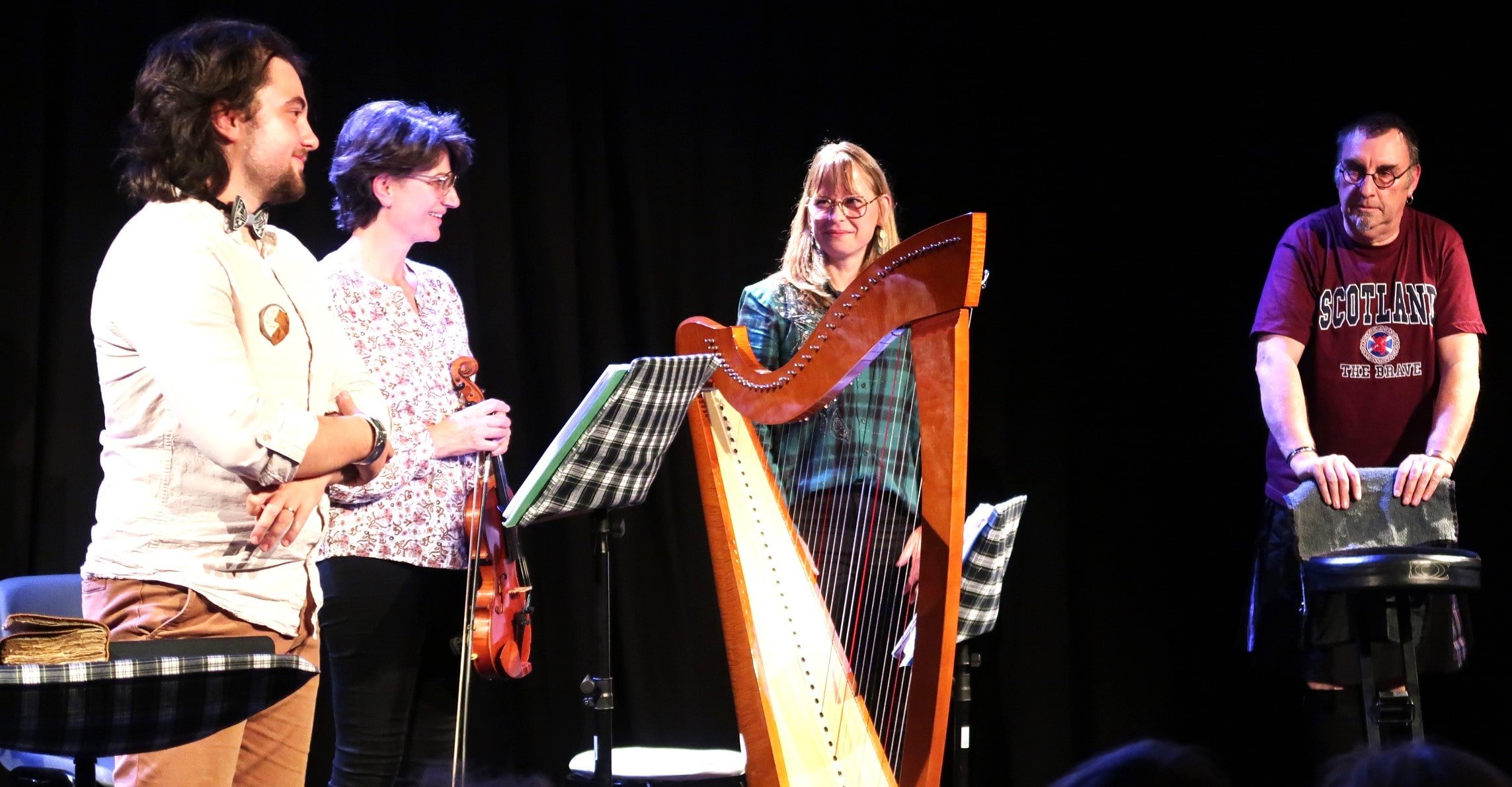 Un public nombreux et enthousiaste a embarqué pour un voyage musical, historique et culturel en Irlande et dans les pays celtiques. Les quatre musiciens du groupe Sweet Saturday ont su retranscrire l’atmosphère envoûtante et authentique de la verte Eirin. Le specacle construit à partir d’un récit tiré du carnet de voyage oublié de Paddy Orson alternait musique populaire, textes poétiques et références historiques. Au rythme des balades et des gigues les spectateurs auraient volontiers poussé les chaises pour s’adonner aux danses celtiques.